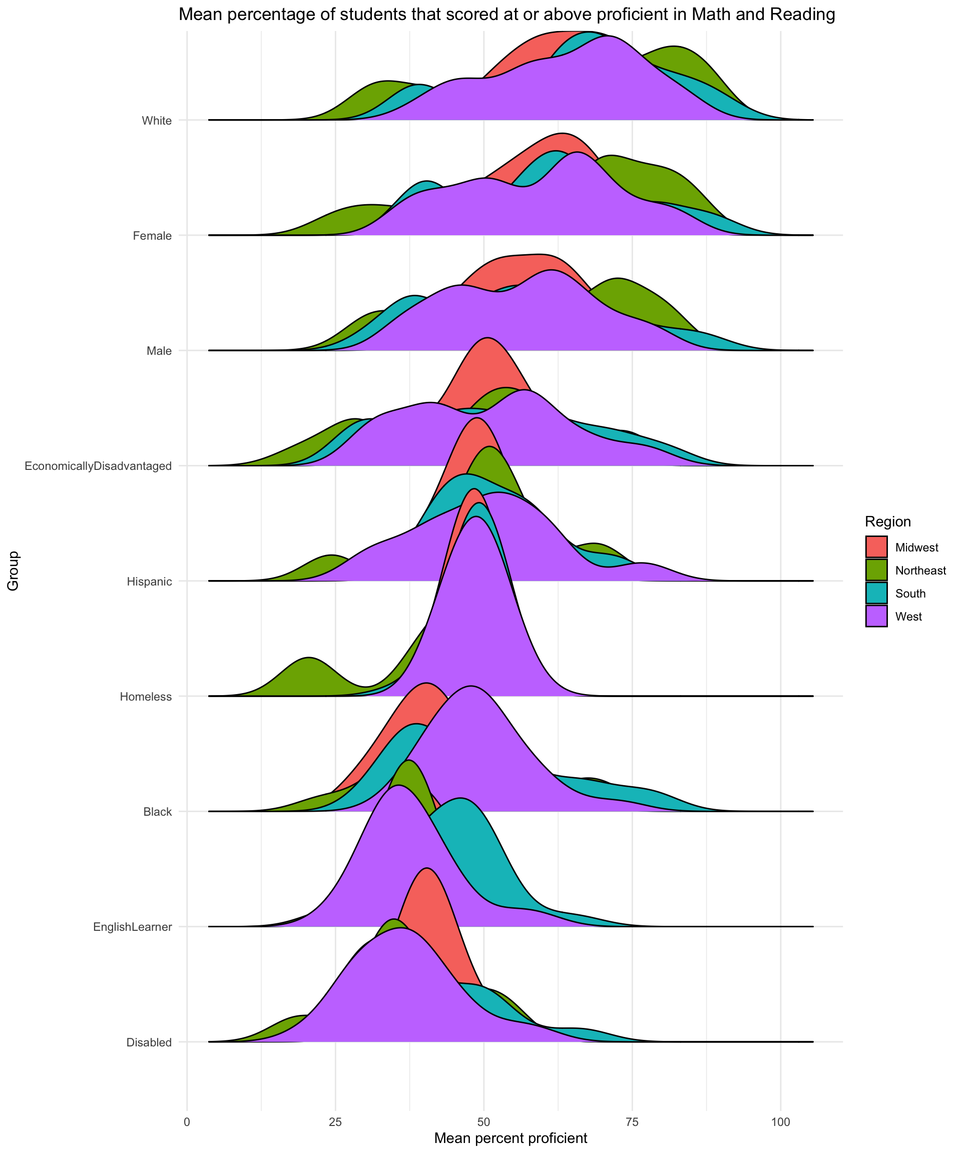 How do high school students’ subgroup makeup (i.e., Race/ethnicity, Male vs. Female, economically disadvantaged, Limited English, Migrant status, Disability status, and Homelessness) and mean test scores in math and reading differ among states/regions?