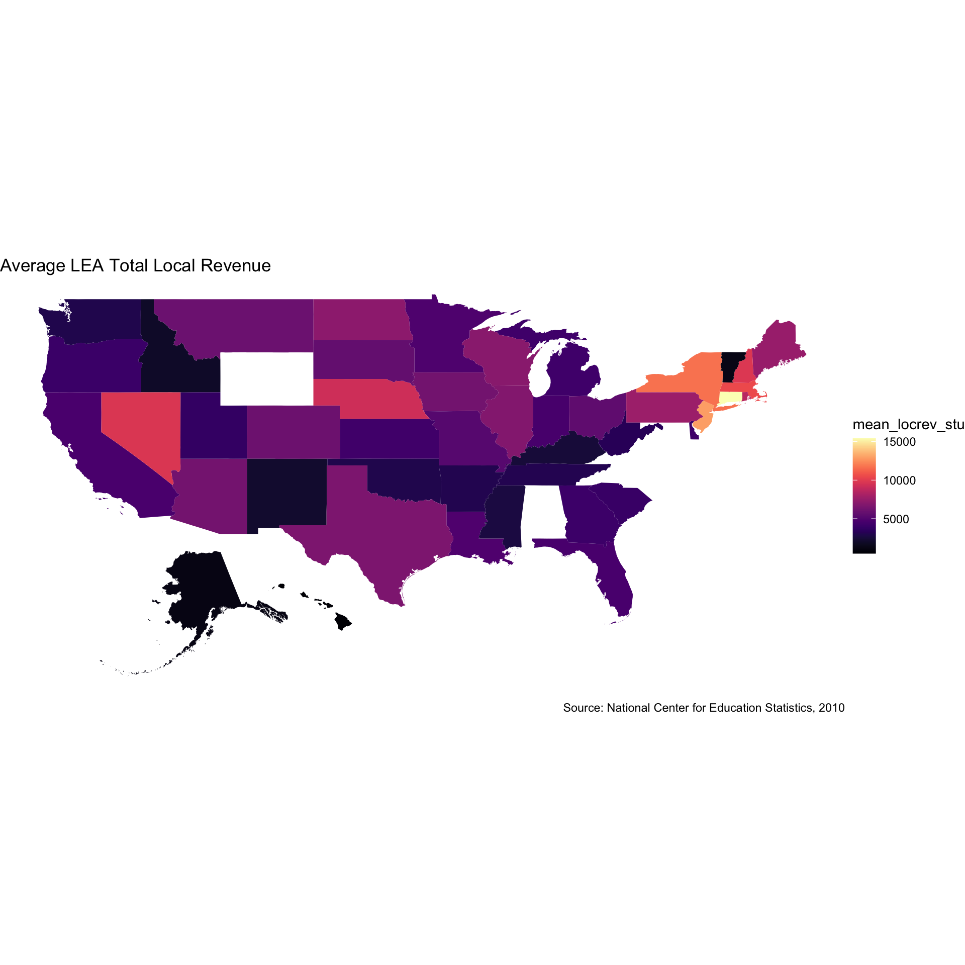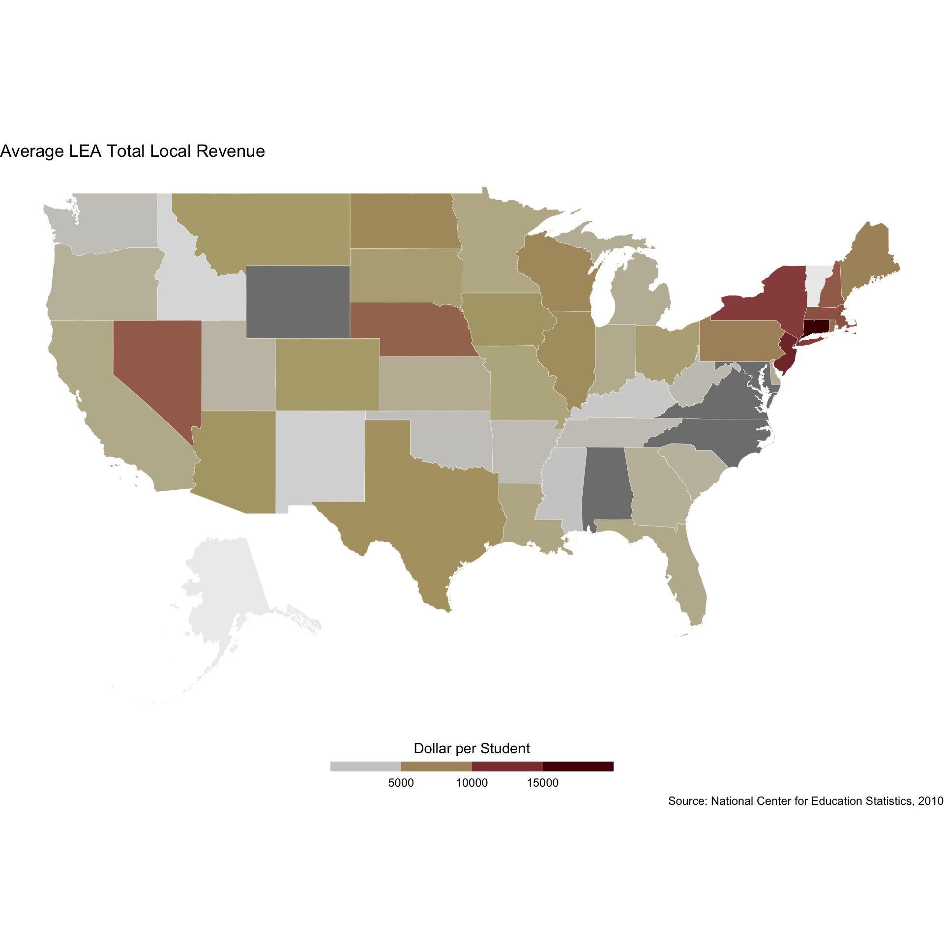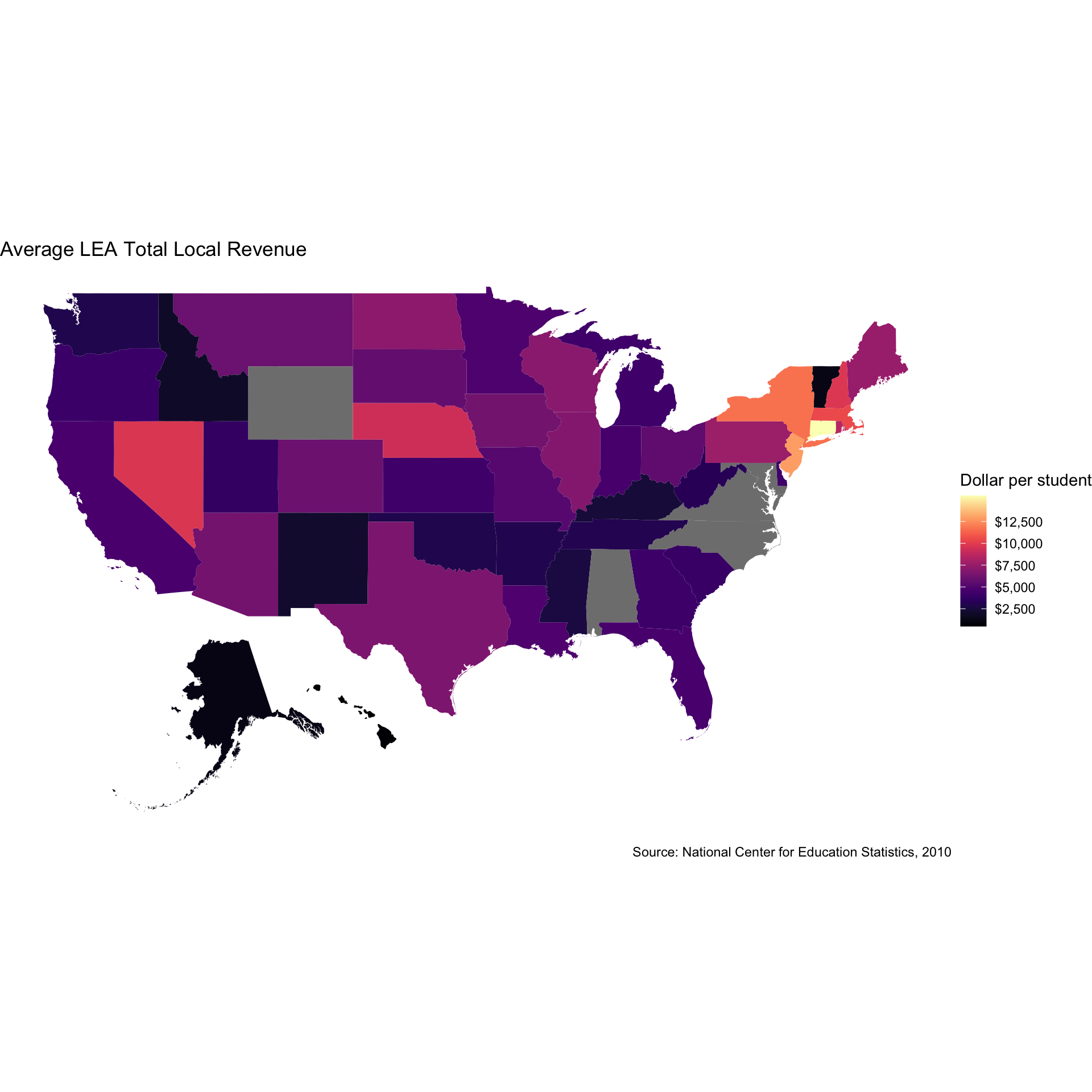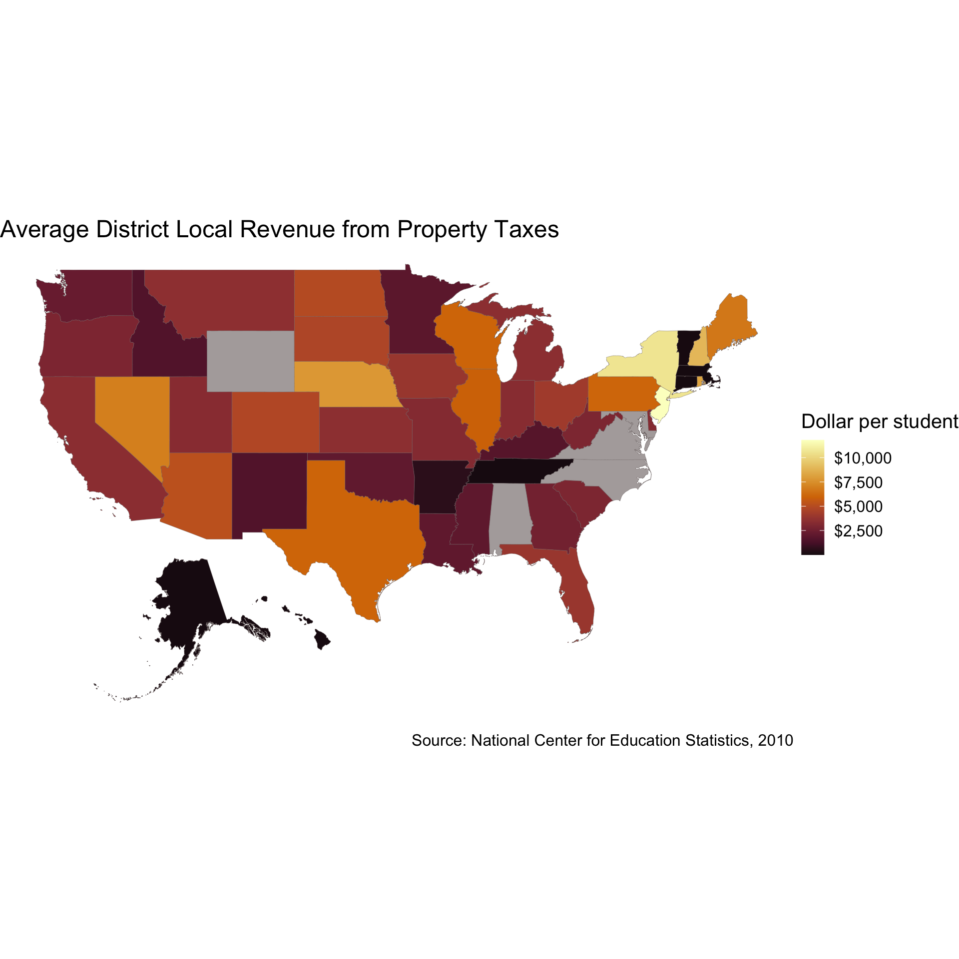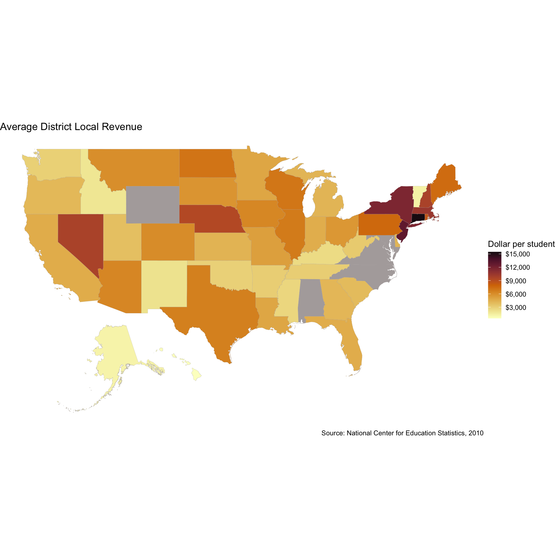 - What is also easier to observe on the maps in comparison to the bar plots is differences between average district local revenue and local revenue from property taxes. For example, Connecticut has the highest total local revenue but no revenue from property taxes. This is easier to see when pivoting between maps than between bar plots.