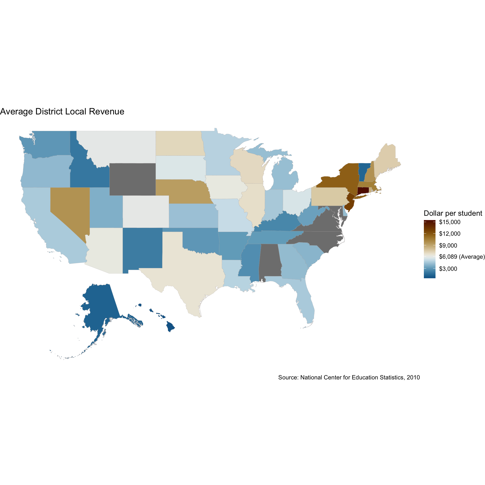 - Prior Version 5 is exploring the use of a divergent color palette. I think the diverging color palette is compelling but communicates a different message (most states have district local revenue near or below the national average instead of overall, states in Northeast have the highest average district local revenue).