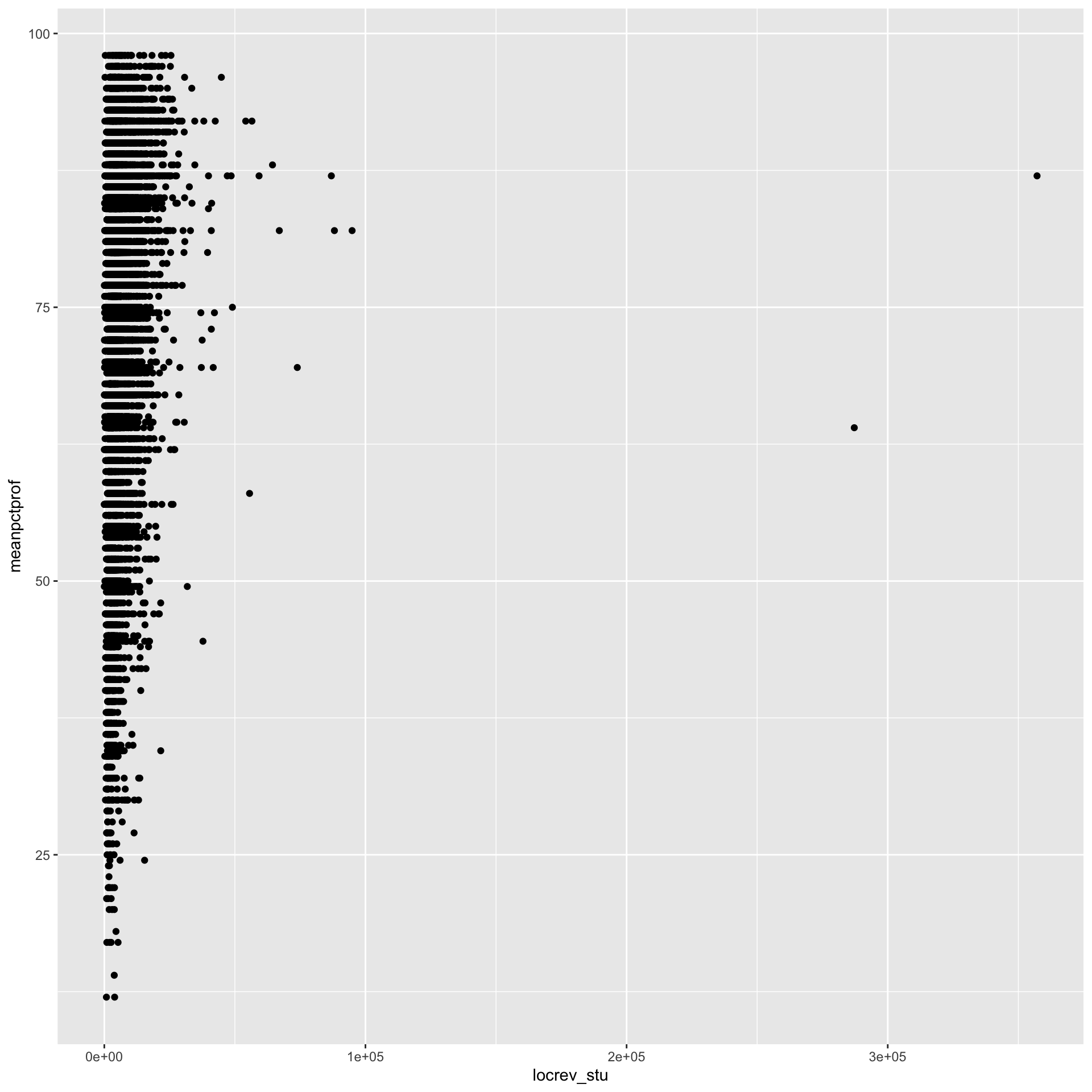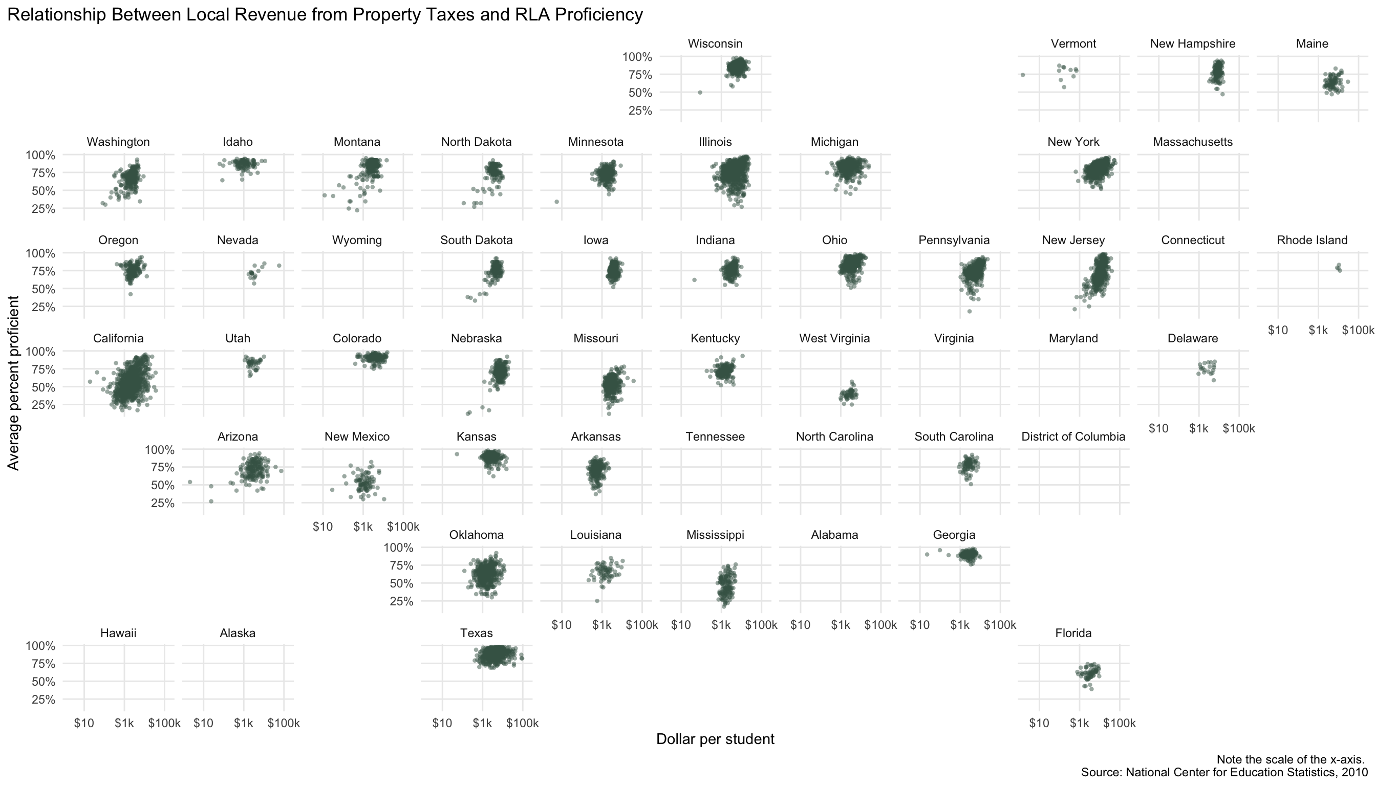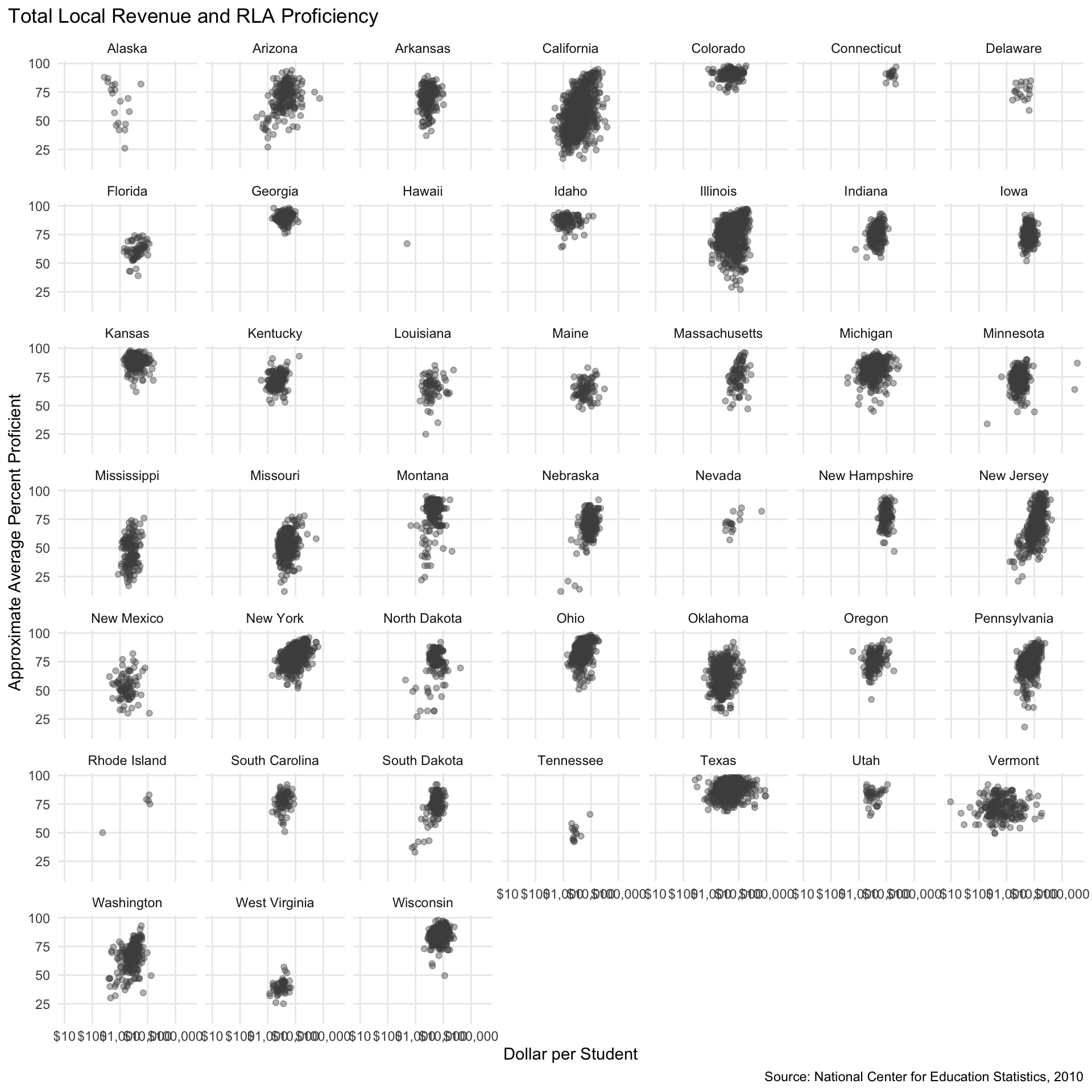 - Given that policies of district funding and property taxes vary at the state level, I wanted to be sure to explore scatterplots faceted by state (Prior Version 4). The upside of this version is that only the states with data are included. However, given regional patterns observed with the bar plots and maps, I opted to use